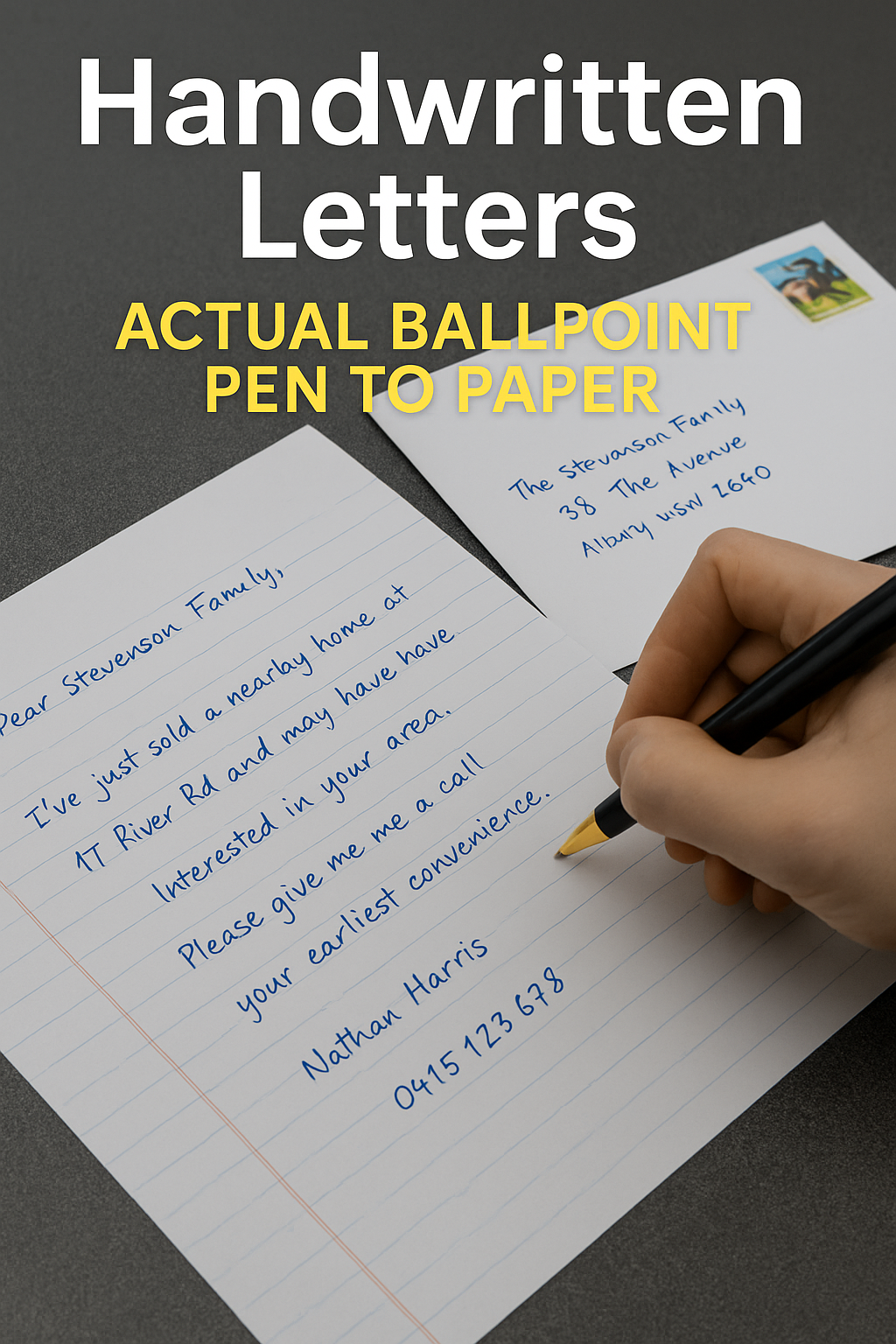 At Aussie Letter, we bring handwritten marketing to the modern era—crafted with real ballpoint pens on premium paper and delivered at unbeatable prices. Whether you're a real estate agent, property manager, or service business, our machine-written letters look and feel truly personal.